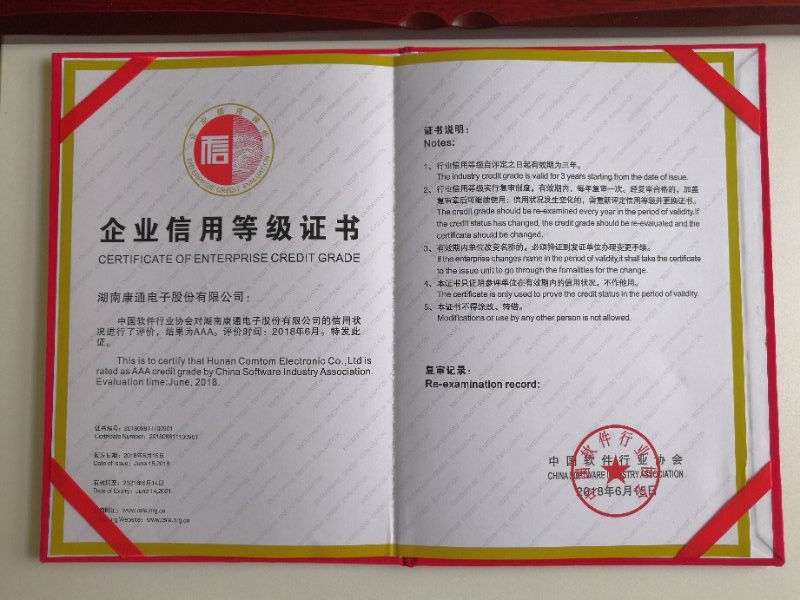2018年6月,在工業(yè)和信息化部的業(yè)務(wù)指導(dǎo)下,根據(jù)中國軟件行業(yè)協(xié)會《中國軟件服務(wù)業(yè)企業(yè)信用評價管理辦法》,經(jīng)過企業(yè)申報、資料審核、專家評審等過程,中國軟件行業(yè)協(xié)會公示了2018年(第十四批次)中國軟件和信息服務(wù)業(yè)信用評價等級的企業(yè)名單,湖南康通電子股份有限公司獲評企業(yè)信用評價AAA級資質(zhì)認(rèn)證。