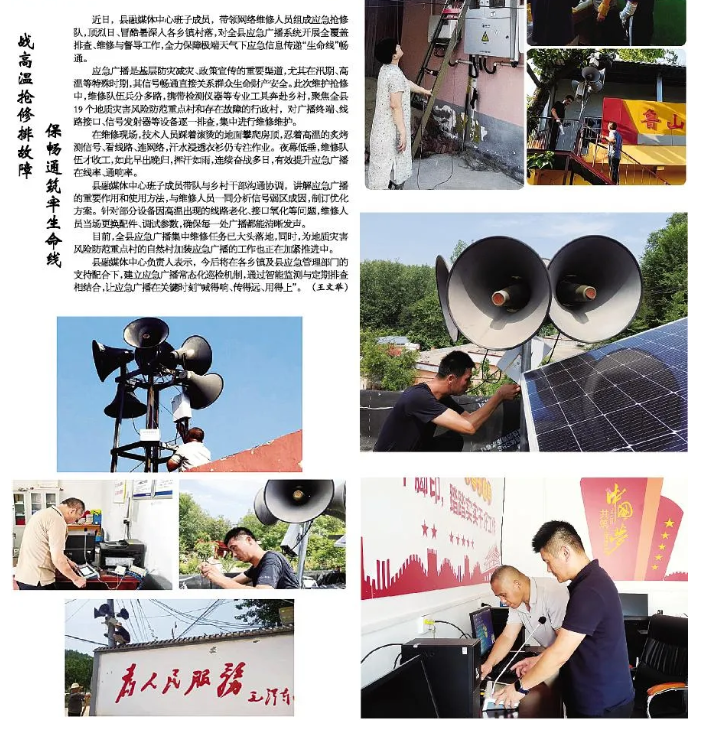 縣融媒體中心班子成員帶隊與鄉(xiāng)村干部溝通協(xié)調(diào),講解應(yīng)急廣播的重要作用和使用方法,與維修人員一同分析信號弱區(qū)成因,制訂優(yōu)化方案。針對部分設(shè)備因高溫出現(xiàn)的線路老化、接口氧化等問題,維修人員當(dāng)場更換配件、調(diào)試參數(shù),確保每一處廣播都能清晰發(fā)聲。