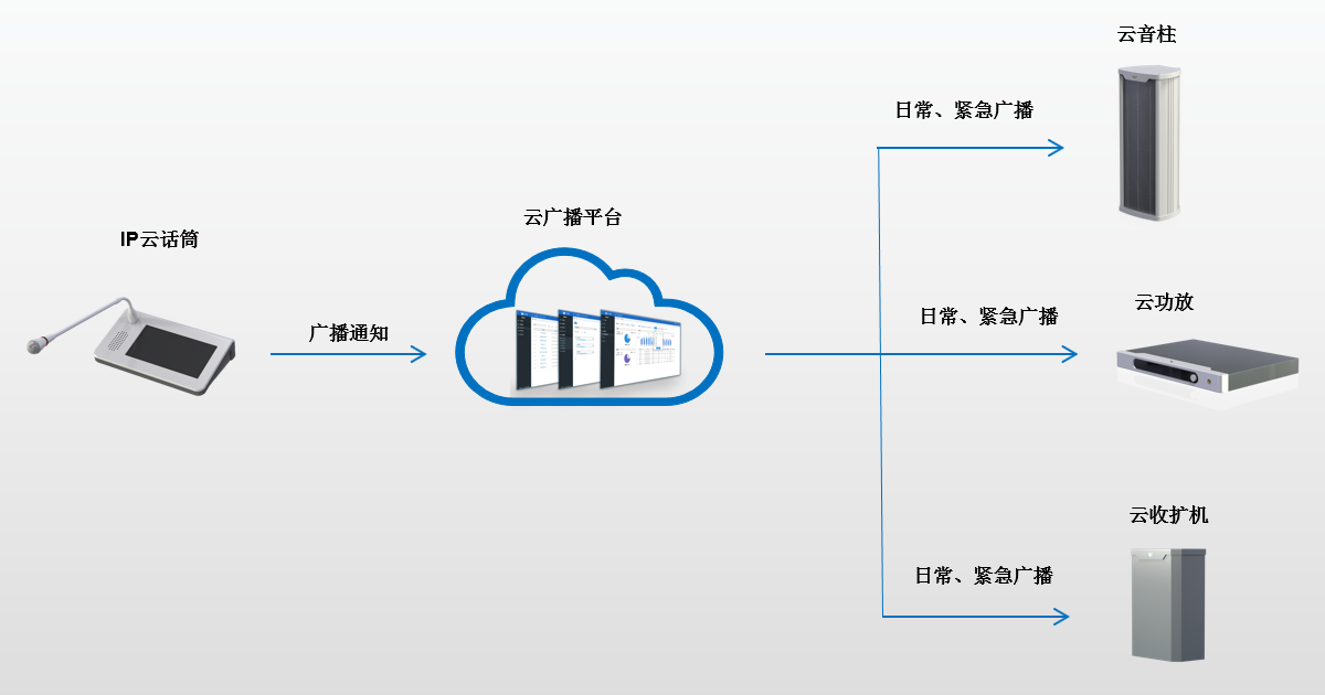 IP云話筒(以下簡稱云話筒)主要部署在廣播室或管理者(如校長、村長等)辦公室,常放置于播控桌或辦公桌上,用戶可以通過一鍵廣播喊話,快速對所管轄或指定的區域發布通知、宣傳教育等。也可以外接音源設備(如手機音頻線、調音臺等),提供高品質的數字音頻流采播到指定的區域播放。該產品采用桌面式設計,精致美觀,工藝考究,現代感十足;使用7英寸全彩LCD顯示屏,全圖形化界面觸控操作。系統連接如圖所示。