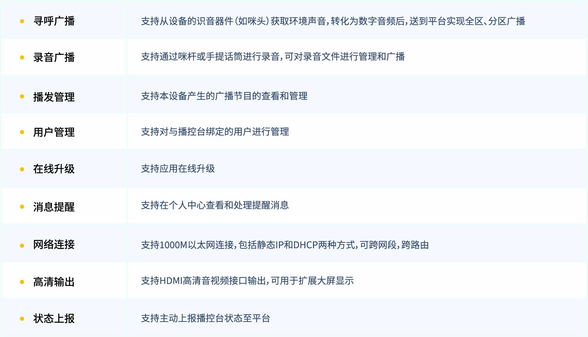 應急廣播播控臺(以下簡稱播控臺)是一款集成廣播、管理于一體的智能設備,可部署于應急廣播系統的相關使用/管理部門或單位、機房或指揮中心。用戶可以通過播控臺,快速對所管轄或指定的區域創建喊話或預警信息,通過應急廣播終端播放出來,達到通知廣大民眾的效果,并且能知曉預警發布的情況及效果。該產品采用桌面式設計,精致美觀,工藝考究,現代感十足,搭載10.1英寸全彩顯示屏,觸控操作,簡單易用。